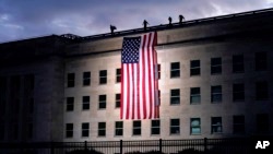 Quốc kỳ Mỹ được giăng tại Ngũ Giác Đài, trước các buổi lễ tưởng niệm tại Đài tưởng niệm 9/11 ở Ngũ Giác Đài để vinh danh 184 nạn nhân bị giết trong cuộc tấn công khủng bố năm 2001 ở Washington, Ảnh chụp ngày 11/92020. (AP Photo/J. Scott).