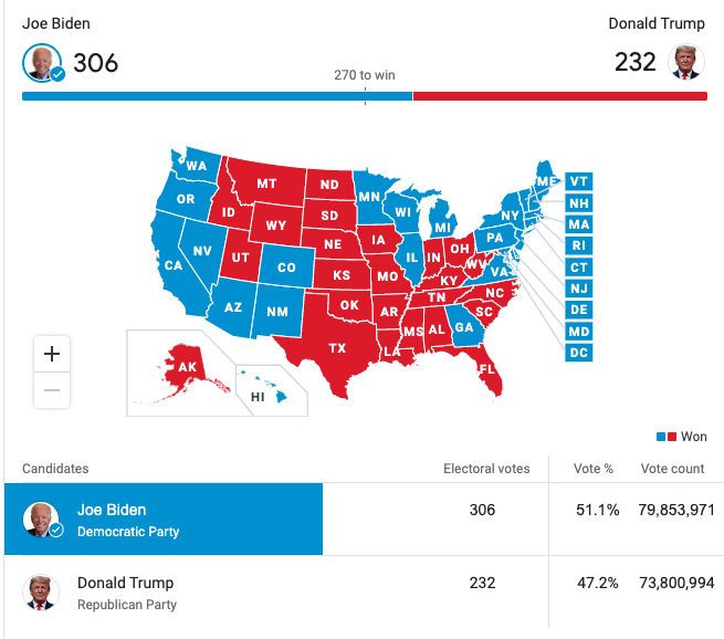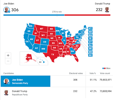 Kết quả bầu cử tổng thống cho đến nay cho thấy cụ Biden được gần 80 triệu phiếu trong khi TT Trump được 74 triệu phiếu. Theo kết quả tạm thời này, cụ Biden đã đắc cử với 306 phiếu cử tri đoàn so với 232 phiếu của TT Trump.