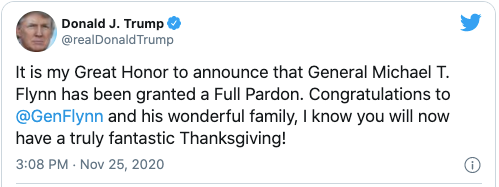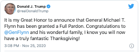 TT Trump cho biết ông đã ân xá trọn vẹn tướng Flynn, là người đã bị công tố Mueller gài bẫy, bắt và truy tố về tội thông đồng với Nga.