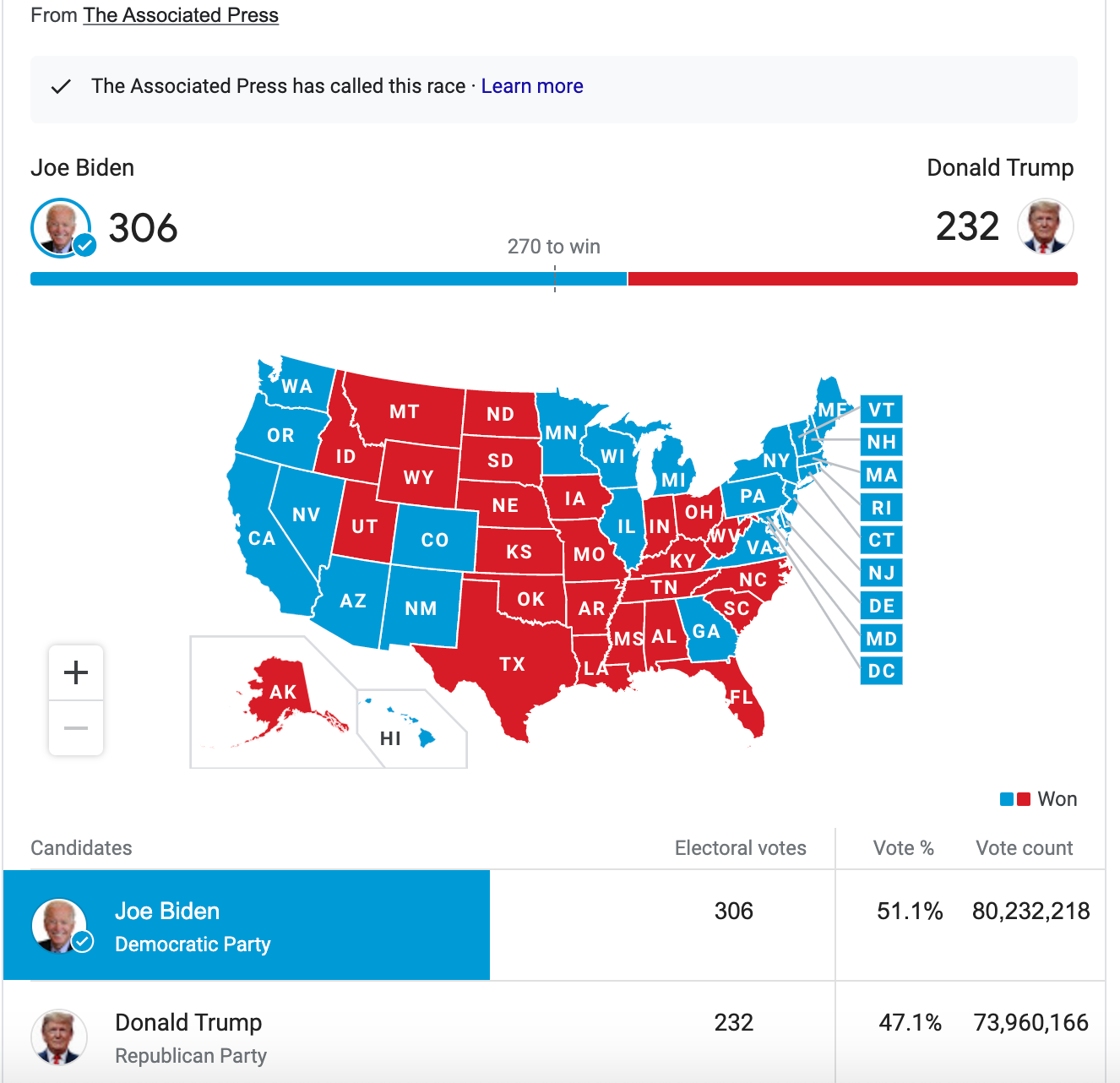 Kết quả bầu cử mới nhất do hãng thông tấn Associated Press cập nhật. Chưa chính thức vì còn nhiều thưa kiện và đếm phiếu lại.