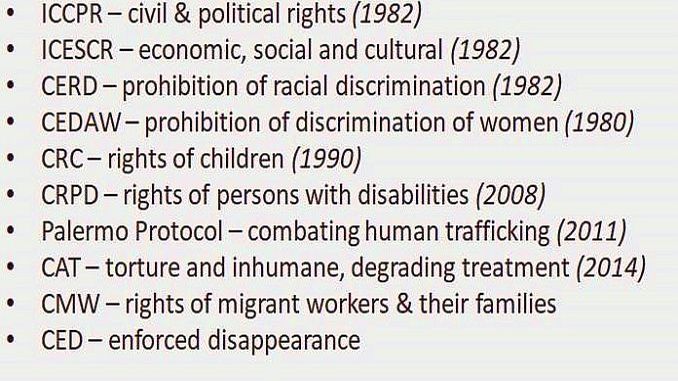 Đến nay, nhà nước Việt Nam đã ký 7 trong số 9 công ước quan trọng nhất của LHQ về nhân quyền, ký Hiệp Định Thư Palermo về chống buôn người, và chấp nhận các điều kiện về quyền lao động, về thể chế pháp trị và về tính minh bạch trong chính quyền trong một số hiệp ước mậu dịch song phương hoặc đa phương.