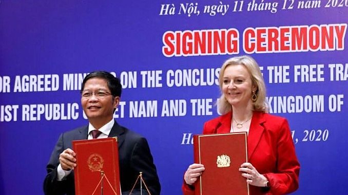 Bộ trưởng Thương mại Anh Liz Truss và Bộ Trưởng Bộ Công thương Việt Nam Trần Tuấn Anh ký kết biên bản kết thúc đàm phán Hiệp định Thương mại Tự do ngày 11/12/2020 tại Hà Nội.