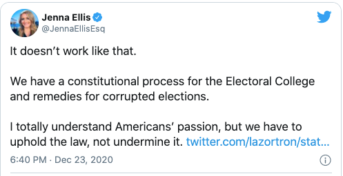 Tiếp theo việc TT Trump tuýt “Martial law = Fake news”, bà Jenna Ellis, luật sư chính thức của TT Trump, đã tuýt bác bỏ chuyện thiết quân luật. Theo bà Ellis, nước Mỹ có luật pháp rõ ràng mà tất cả đều phải tôn trọng.