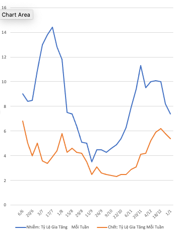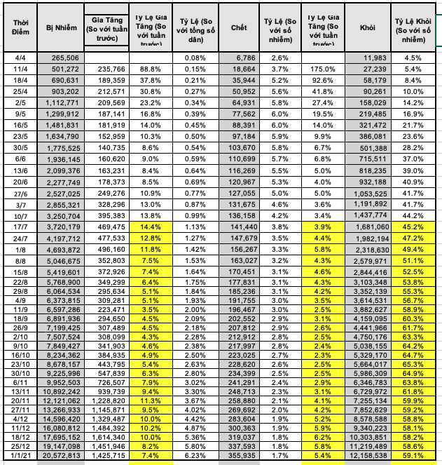 Tổng số người bị nhiễm đã vượt qua 20,5 triệu, trong khi số tử vong đã lên tới gần 356.000. Tuy nhiên theo thống kê chính, tình hình không bi thảm như TTDC hù dọa. Trái lại, tuy các con số bị nhiễm và tử vong vẫn tiếp tục tăng, nhưng tỷ lệ gia tăng đã chậm lại hẳn so với cuối tháng 10, đầu tháng 11.