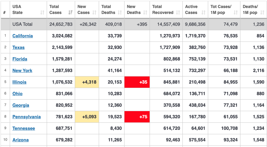 Tuy COVID tiếp tục tấn công và số người bị nhiễm đã vượt qua mức 25 triệu, trong khi số người leo qua mức 420.000, biểu đồ cho thấy gia tăng của số người nhiễm cũng như số tử vong đã giảm mạnh trong tuần qua.