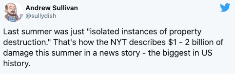Lời mô tả này thô bỉ đến độ chính anh Andrew Sullivan, một cây bút thiên tả chống Trump mạnh nhất, cũng phải lên tiếng chỉ trích và vạch ra “nhũng vụ đập phá đơn độc đó đã gây ra thiệt hại thiệt hại tới 1-2 tỷ đô, lớn nhất lịch sử Mỹ”.