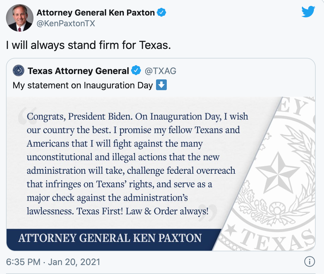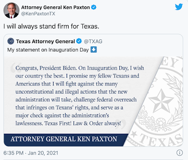 Ngay trong ngày cụ Biden tuyên thệ nhậm chức, bộ trưởng Tư Pháp Texas, ông Ken Paxton đã long trọng cảnh cáo ông sẽ thưa kiện cụ Biden, chống tất cả các quyết vi phạm luật và vi phạm Hiến Pháp của chính quyền Biden.