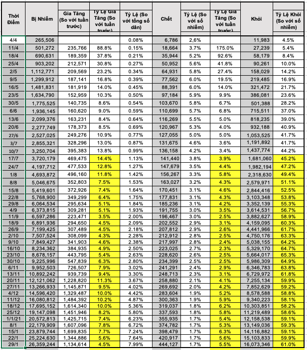 – Số người khỏi bệnh đã lên tới trên 16 triệu hay 61% số người nhiễm, nghĩa là trong 10 người bị nhiễm, đã có 6 người khỏi.