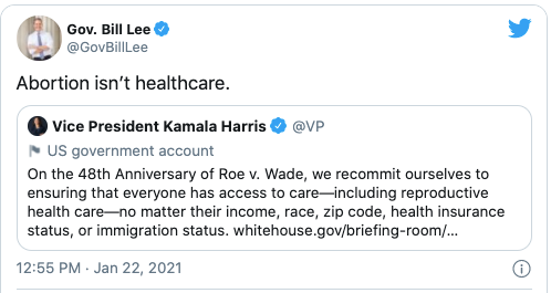 Ngay sau đó, thống đốc tiểu bang Tennessee Bill Lee, một ông CH bảo thủ, đã lên tiếng sửa lưng bà, cho rằng phá thai không phải là chăm sóc sức khoẻ của ai hết. Đúng vậy, phá thai chỉ là hành động giết thai nhi, sao lại có thể gọi là chăm sóc sức khoẻ?