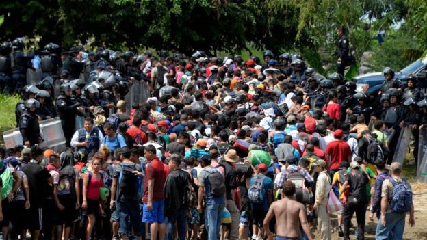 Dòng người từ Honduras đi qua Guatemala đến Mexico với hy vọng vào Hoa Kỳ. Cảnh chụp ở sông Suchiate từ Ciudad Tecun Uman ở Guatemala sang Ciudad Hidalgo của Mexico, với công an cảnh sát Mexico đứng nhìn dòng người qua sông hôm 29/10/2018.