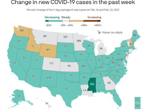 – Bản đồ dưới đây xác nhận hầu hết các tiểu bang đều thấy COVID thoái lui.