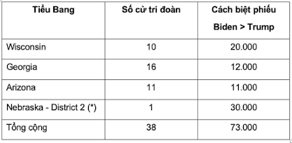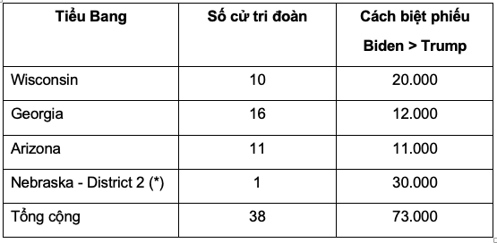(*) Nebraska có luật bầu tổng thống riêng biệt, chia số cử tri đoàn theo tổng số phiếu bầu cả tiểu bang, do đó, tại District 2, cụ Biden hơn TT Trump 30.000 phiếu nên được cấp 1 phiếu cử tri đoản.