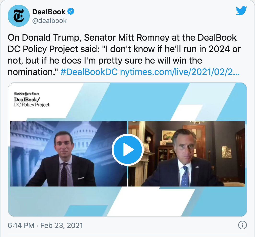 Nhưng trong một cuộc phỏng vấn mới đây của báo New York Times, ông Romney cho rằng hậu thuẫn của TT Trump vẫn còn thống trị đảng CH, và nếu ông Trump ra tranh cử tổng thống năm 2024, ông sẽ chiến thắng, hạ tất cả ứng cử viên của đảng CH một cách áp đảo dễ dàng.