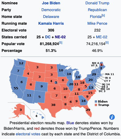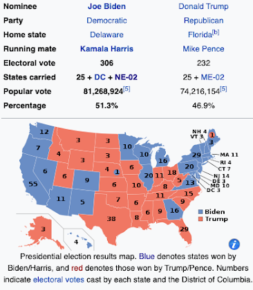 Kết quả chính thức của cuộc bầu tổng thống đã được xác nhận như bản đồ dưới đây cho thấy, với cụ Biden có 81 triệu phiếu và TT Trump được hơn 74 triệu phiếu, khác biệt hơn 7 triệu phiếu.