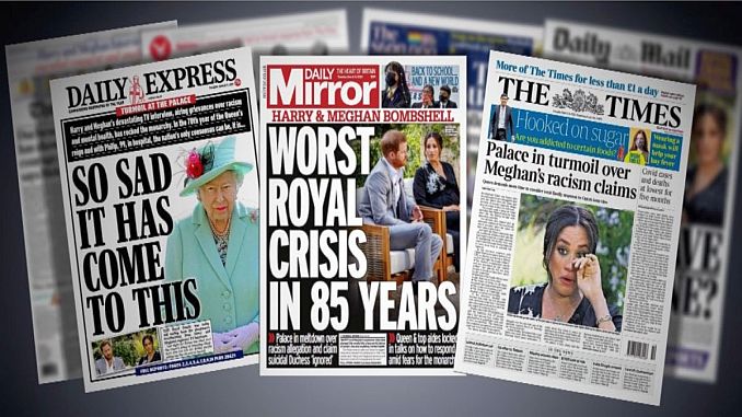 Giới truyền thông nước Anh ghi nhận rằng dư luận “gần như chia đôi” qua những phản ứng dồn dập sau khi theo dõi cuộc phỏng vấn Harry và Meghan trên CBS và các đài truyền hình khác. Phe chỉ trích được đại diện bởi nhà truyền thông nổi tiếng Piers Morgan trên chương trình Good Morning Britain của ITV. Ông Morgan tỏ ý nghi ngờ sự thành thật của Meghan Markle, cho rằng cuộc phỏng vấn vợ chồng Hoàng Tử Harry là “một thủ đoạn bỉ ổi nhằm hạ uy tín của Hoàng gia Anh”, và lý luận rằng câu chuyện giả định về màu da đứa bé không mang ý nghĩa kỳ thị chủng tộc nào cả. Một số ít người tán đồng quan điểm này, ngược lại có tới 41,015 khán thính giả gửi thư phản đối kịch liệt, hậu quả là ông Piers Morgan đã phải rời khỏi chương trình Good Morning Britain. Ngoài ra nhiều nhân vật trong và ngoài giới truyền thông cũng lên tiếng công kích ông Morgan, chẳng hạn như ký giả Susanna Reid, bác sĩ Shola Mos-Shogbamimu, nữ tài tử Trisha Goddard v.v…