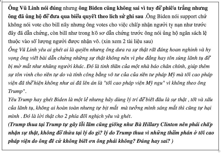 Điều cuối cùng đặc biệt tôi muốn nói sơ qua với ô/b Quy Truong: chuyện Tối Cao Pháp Viện “ngu” hay khôn, hay chuyện Trump tranh cử với bà Hillary chẳng dính dáng gì đến chuyện cụ Biden và dân tị nạn. Kỹ thuật tranh luận bình thường, khi cãi không lại, luôn tìm cách chuyển đề tài. Đó là việc làm trẻ con, tôi không bàn thêm.