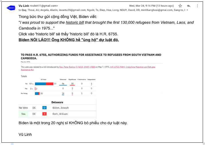 Về các biểu quyết của TNS Biden, xin tóm tắt lại là khi đó, có 3 biểu quyết quan trọng nhất, đáng nói. Đó là biểu quyết về các dự luật S.1484, H.R. 6755, S.R. 148. (Trong thư gửi cộng đồng, cụ Biden cũng khoe đã đồng bảo trợ một dự luật cải tổ luật di trú, nhưng luật này chẳng liên quan sơ múi gì đến người tị nạn Việt, nên kẻ này không bàn tới),