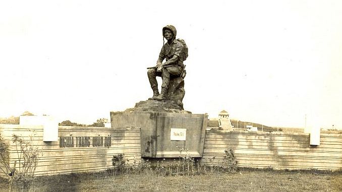 Trên không gian rộng thoáng, từ mọi hướng, người ta có thể nhìn thấy bức tượng cao, nổi bật trên nền trời xanh. Đó là người lính từ chiến trường về thăm mộ đồng đội, quân phục, ba-lô lấm bụi, súng trường gác trên hai đùi, lưỡi lê ngang hông, dây quai nón sắt buông thỏng như sợi buồn rơi vào cõi vô định. Anh ngồi thẫn thờ, đôi mắt buồn nhìn xa xăm, thương tiếc cho người bạn vừa nằm xuống. Bức tượng trong bối cảnh đó trở nên có hồn hơn và nhiều chuyện linh thiêng của bức tượng đã không ngớt lưu truyền trong dân chúng lúc đó.