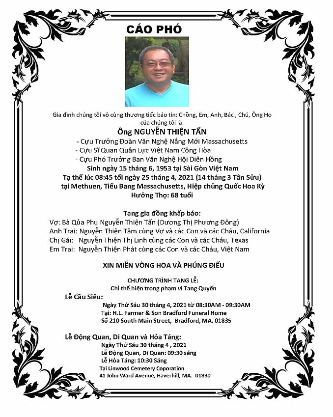 Gia đình chúng tôi thành kính phân ưu cùng Bà Quả phụ Nguyễn thiện Tấn, nhử danh Dương Thị Phương Đông và tang quyến!