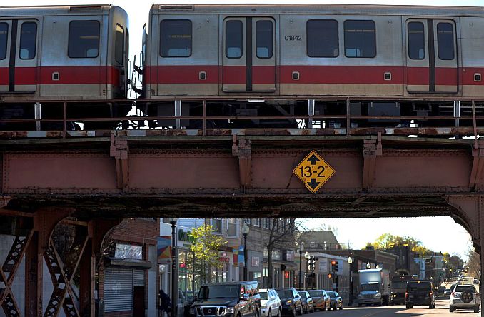 Đường xe điện Đỏ MBTA đi ngang qua trên đại lộ Dorchester ở Fields Corner. (Hình của DAVID L. RYAN / GLOBE STAFF)