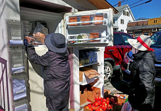 Những người có nhu cầu lấy thức ăn miễn phí từ tủ lạnh cộng đồng gần đường xe điện Đỏ MBTA ở Fields Corner. (Hình của DAVID L. RYAN / GLOBE STAFF)