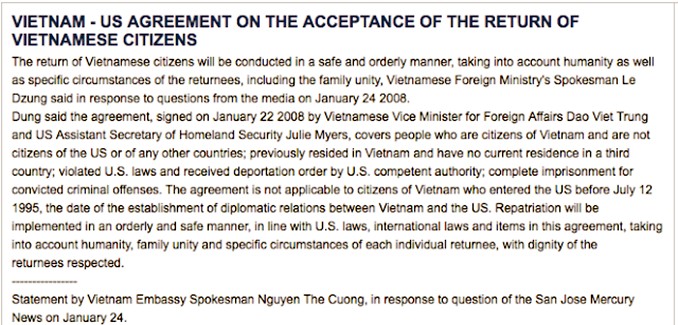 Dưới đây là nguyên văn thông cáo chính thức của tòa đại sứ VC ghi rõ thoả ước 2008 này chỉ bảo đảm “công dân VN” (Vietnamese citizens) tức là dân VC, qua sau 12/7/1995 nếu phạm pháp phải được trả về VN theo đúng luật Mỹ, trong trật tự và nhân đạo. Không có điều khoản nào “theo đó, những người Việt Nam tị nạn đến Mỹ trước ngày 12 Tháng Bảy, 1995, không bị trục xuất”.