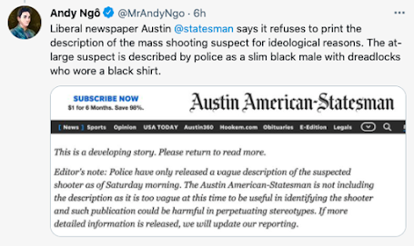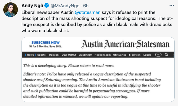 Theo bản tin của nhà báo gốc Việt Andy Ngô, đúng theo phong trào thượng tôn da đen, báo Austin American Statesman đã không mô tả hung thủ bị lùng bắt là một thanh niên da đen, vì theo tờ báo, việc loan tin này sẽ chỉ có tác dụng củng cố hình ảnh tiêu biểu sai lầm về tội phạm ở Mỹ.