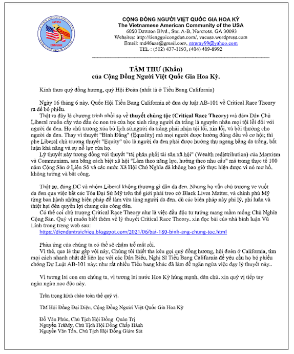 Cộng Đồng Người Việt Quốc Gia đã ra ‘Tâm Thư’ khẩn, kêu gọi cộng đồng tị nạn lên tiếng về việc quốc hội Cali sẽ biểu quyết dự luật AB-101 nhằm cho phép dạy môn ‘Critical Race Theory’ trong các trường học của tiểu bang.