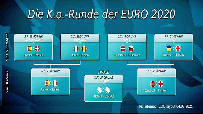 Tôi mạn phép ghi lại ngày tranh tài trận Bán Kết vào ngày 06/07. Juli và Chung Kết (11.Juli 2021) sẽ tranh tài tại Wembley Stadion / London. Ở đó chính phủ Anh đã cho phép 60 ngàn người được xem các trận đấu bất chấp sự phát triển Corona mới.
