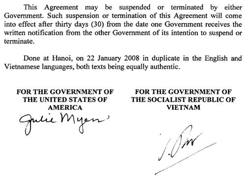 Thỏa thuận được ký kết với Việt Nam năm 2008 dưới thời cựu Tổng thống George W. Bush. Có bao gồm một điều khoản cấm trục xuất di dân Việt Nam đã đến Hoa Kỳ trước tháng 7 năm 1995, thời điểm lúc hai nước thiết lập quan hệ ngoại giao.