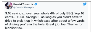 Cái tuýt này đã mau mắn trở thành chuyện diễu dở tiếu lâm nhất của năm qua, khi hàng trăm độc giả góp ý, công kích hay chọc quê cái tuýt ngớ ngẩn này. Kể cả ông con của ông thần Trump cũng chọc quê theo: