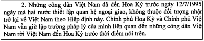 Dưới thời TT Clinton, Mỹ điều đình với CSVN về việc trả dân tị nạn phạm tội này về VN nhưng không đi đến đâu vì VC không nhận. Đến thời TT Bush con, Mỹ đi được một bước, ký được một Bản Ký Chú trong đó CSVN chịu nhận lại những người Việt phạm tội, nhưng chỉ nhận những người qua Mỹ kể từ ngày 12/7/1995 và sau đó, vì đó là ngày TT Clinton nhìn nhận CSVN. Đây là nguyên văn Điều 2 Bản Ký Chú Bush-VC: có ghi rõ những người qua trước 12/7/1995 “KHÔNG thuộc đối tượng NHẬN TRỞ LẠI”, tức là VC không chịu nhận, còn gì phải giải thích nếu chưa quên tiếng Việt, hay nếu không muốn xuyên tạc?