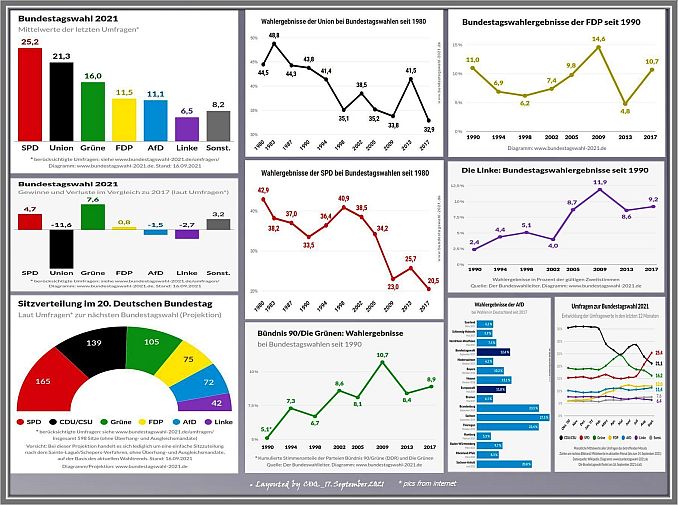 Một tuần trước cuộc bầu cử Quốc hội Đức (Bundestag), Liên đảng CDU/CSU đang cầm quyền đã mất đi sự ủng hộ của cử tri dành cho họ theo kết quả thăm dò ý kiến mới nhất kể trên. Kết quả cho thấy Liên đảng mất đi khoảng mười phần trăm chỉ còn hơn 20% so với kết quả bầu cử năm 2017. Ngược lại thì sự ủng hộ dành cho SPD và Xanh tăng, nhất là SPD đang dẫn đầu, hơn CDU/CSU 4-5%.