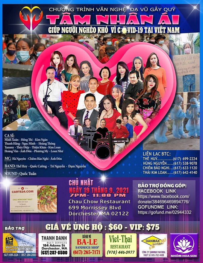 Q Smile Dental Spa, Plumbing & Heat Max Contractors, Thanh Danh Multi-Services, Carte 24, Kelley Nails Supply, Boston Auto Tech, T&T Nails Supply (CT), Bánh Mì Ba Lẹ, Danmax Natural, Việt Thái Restaurant, Vinna Auto Services, Family Dentistry (Judy Nghiêm), Boston Wellness Health Care, Quốc Tuấn Âm Thanh, Phở Lê, Phở Countryside, Saigon One Restaurant, Galaxy Pharmacy, V Ballroom Dance Sport, Trang-Phong (Bánh Phu Thê), Nghệ Nhân Trang Trần (Thư Pháp), Thánh Thất Cao Đài Boston. Và đặc biệt xin cám ơn Nhóm Văn Nghệ Hoa Sen đã tích cực đóng góp công sức và tài chánh trong suốt chương trình.