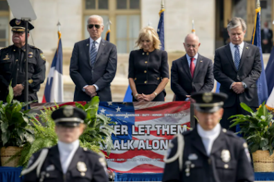 Từ trái qua: cụ Biden và phu nhân, ông Mayorkas, giám đốc FBI Wray. Trong buổi lễ ghi ơn cảnh sát ngày 16/10/2021. Ghi nhận: không ai đeo khẩu trang hết!