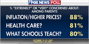 Thăm dò của Fox News chú tâm và kinh tế, cho thấy trong 10 người thì đã có gần 9 người (87%) rất lo ngại về lạm phát, trong khi xấp xỉ 3/4 dân lo về những chuyện lớn khác.