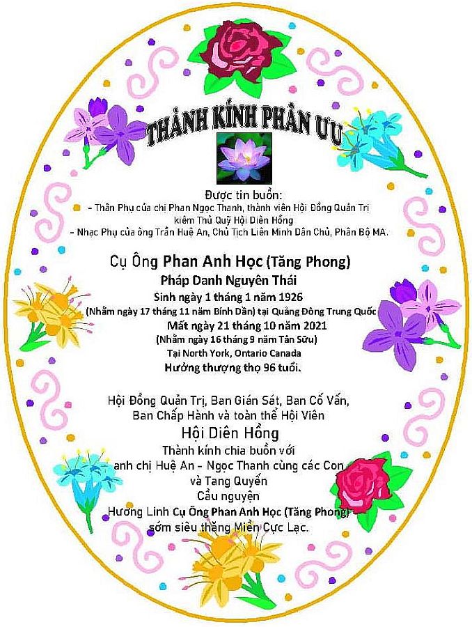 Hội Diên Hồng Phân Ưu Cùng Tang Quyến Cụ Ông Phan Anh Học (Tăng Phong) 10/23/2021 Hoàng Hiếu Tin Cộng Đồng 0
