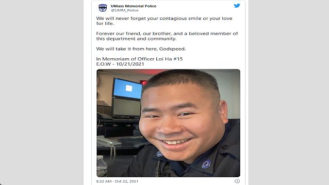 Tiểu bang Massachusetts cho biết anh Hà Hữu Lợi, 34 tuổi, một cảnh sát của Trung tâm Y tế UMass Memorial, đã qua đời vì nhiễm Covid-19. Bản tin cho biết từ lúc nhỏ anh Lợi rất thích được làm cảnh sát, và anh đã cố gắng trở thành cảnh sát viên của bệnh viện đại học UMass Memorial Medical Center được 5 năm.