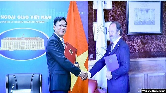 Thứ trưởng Ngoại giao Phạm Quang Hiệu và Tổng Thư Ký PCA Hugo Siblesz tại lễ ký kết ngày 27/10/2021. Photo Bao Quoc Te.