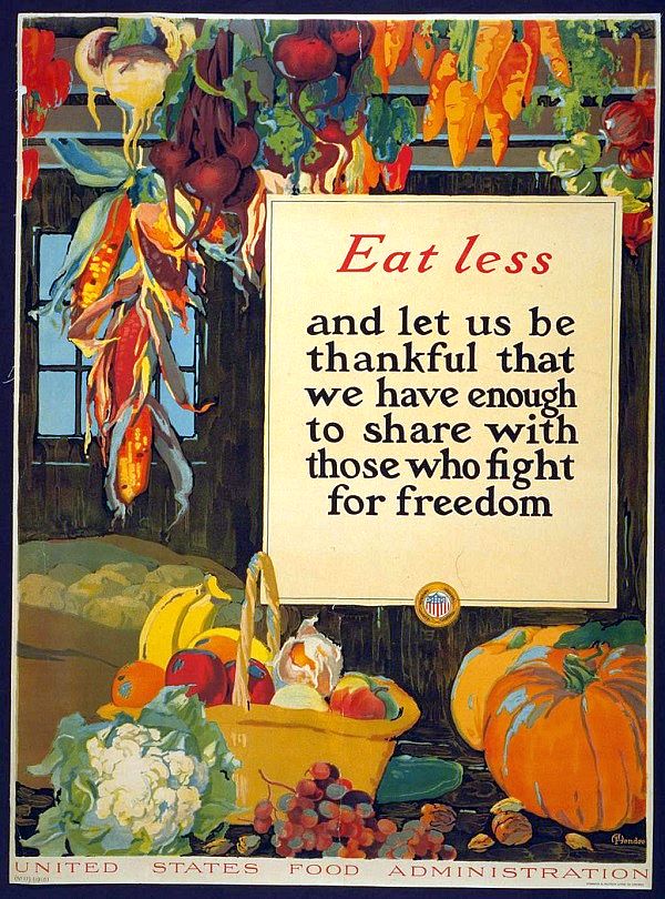 Lễ Tạ Ơn năm ấy ở Mỹ không được thịnh soạn như những lần trước. Nhiều mặt hàng vắng bóng vì mọi người phải thắt lưng buộc bụng cho chiến tranh. Cả năm qua chính phủ kêu gọi người dân bớt ăn thịt, giảm thiểu tối đa các món cần nhiều đường, ăn nhiều rau quả và trái cây hơn. Thậm chí truyền thông nhà nước còn tung ra những khẩu hiệu như “Food will win the war” — thức ăn sẽ cho ta chiến thắng!