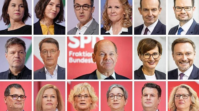 Bộ trưởng của Liên minh “Đèn giao thông (gồm Đỏ (SPD) + Vàng (FDP) + Xanh)”: SPD có bảy bộ trưởng trong chính phủ mới: Wolfgang Schmidt (Bộ Trưởng phủ Thủ tướng), Karl Lauterbach (Y tế), Hubertus Heil (Lao động và Xã hội), Nancy Faeser (Nội vụ), Christine Lambrecht (Quốc phòng), Klara Geywitz (Xây dựng ) và Svenja Schulze (Phát triển).