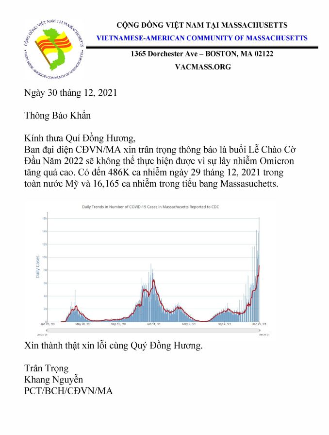 Nhận thấy tình trạng đại dịch COVID-19 đang gia tăng mạnh tại tiểu bang Massachusetts, BCH/CĐVN/MASS và BTC Lễ Chào Cờ Đầu Năm 2022 tại Boston đành phải hủy bỏ việc tổ chức buổi lễ này trước dự trù vào ngày 1 tháng 1 năm 2022 dương lịch.