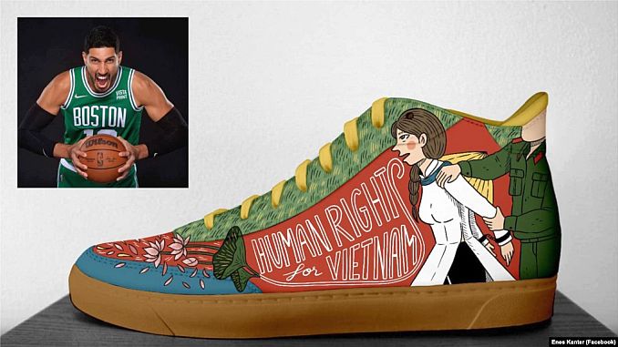 Cầu thủ bóng rổ chuyên nghiệp của Mỹ, Enes Kanter Freedom (trong ảnh nhỏ), và chiếc giày của anh được vẽ tay hình ảnh về đàn áp nhân quyền ở Việt Nam.