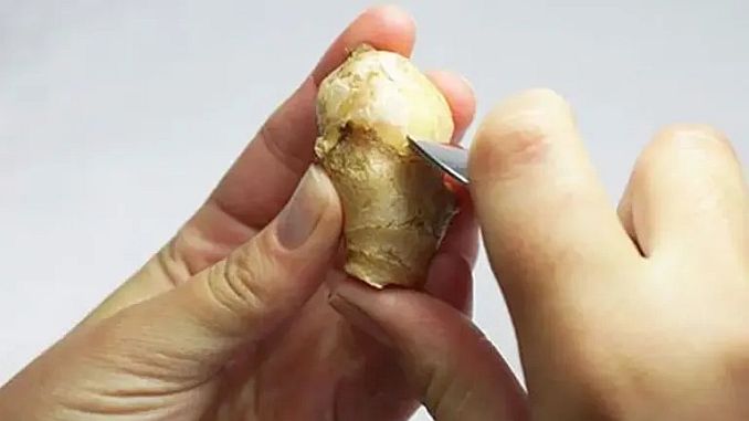 Một mẹo vặt nhà bếp dành cho các chị em nữa đó là: Bóc vỏ gừng bằng một chiếc thìa dễ và nhanh hơn là sử dụng dao như cách bạn vẫn thường dùng. Việc của bạn là chỉ cần lấy chiếc thìa cạo vào củ gừng là vỏ sẽ ra. Vừa nhanh, tiết kiệm thời gian nữa chớ.