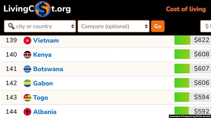 Ví trí này khá sát với xếp hạng về Việt Nam của World Population Review, một tổ chức độc lập và phi chính trị có trụ sở ở California, Mỹ. Trên trang web mang tên worldpopulation.com của tổ chức này, Việt Nam đứng thứ 136/197 nước và vùng lãnh thổ về mặt chi phí sinh hoạt, với chi tiêu bình quân là 639 đô la/tháng.