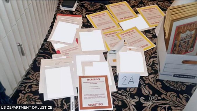 Một số tài liệu mật được tìm thấy ở nhà cựu Tổng Thống Donald Trump tại Mar-a-Lago. (Hình: Bộ Tư Pháp Mỹ)