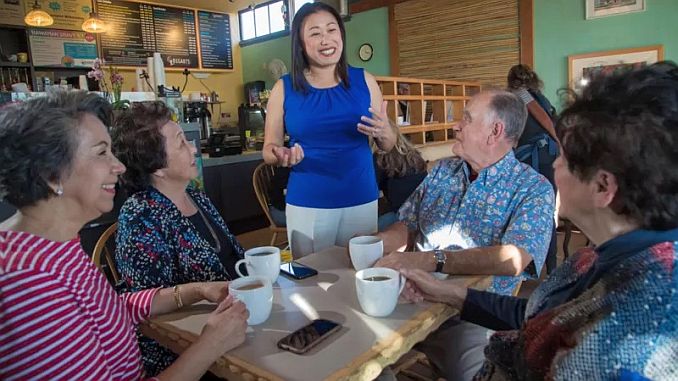 Bà Janet Nguyễn (áo xanh, đứng) thuộc đảng Cộng hòa, cựu Thượng nghị sĩ tiểu bang, cựu Giám sát viên Quận Cam, và cựu Nghị viên thành phố Garden Grove sẽ ra tranh cử trong cuộc bầu cử giữa kỳ 2022 ở Mỹ. (Ảnh của JANET2022.COM)