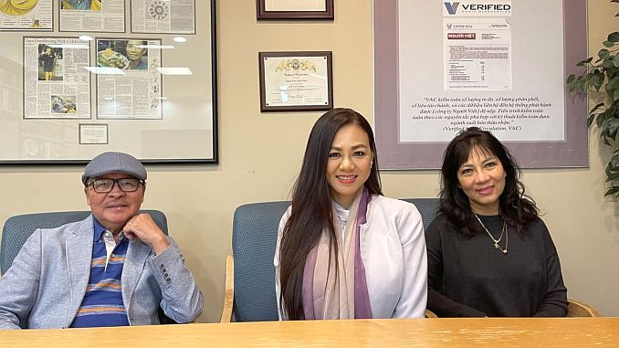 Từ trái, nhạc sĩ Nam Lộc, đạo diễn Thanh Tâm, và tài tử Tina Thúy, tại nhật báo Người Việt. (Hình: Đỗ Dzũng/Người Việt)