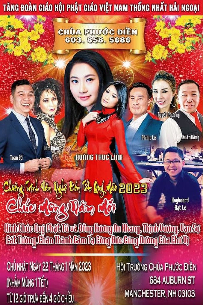 22/1/2023: Chùa Phước Điền NH Đón Tết Quý Mão 01/13/2023 Hoàng Hiếu Thông Báo 0 Thời gian: Chủ nhật ngày 22/1/2023 từ 12 giờ trưa đến 4 giờ chiều Địa điểm: Hội trường Chùa Phước Điền, 684 Auburn St., Manchester, New Hampshire 03103