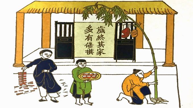 Tranh dân gian về lễ dựng nêu. (Hình: archives.org.vn – Trung Tâm Lưu Trữ Quốc Gia I)